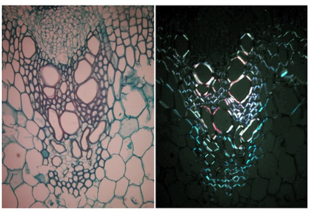 前一篇用偏光顯微鏡看淀粉粒,這一篇再接再厲,弄了個(gè)向日葵莖的玻片放在顯微鏡下看。左邊是一般光線,右邊是在偏光下觀察,