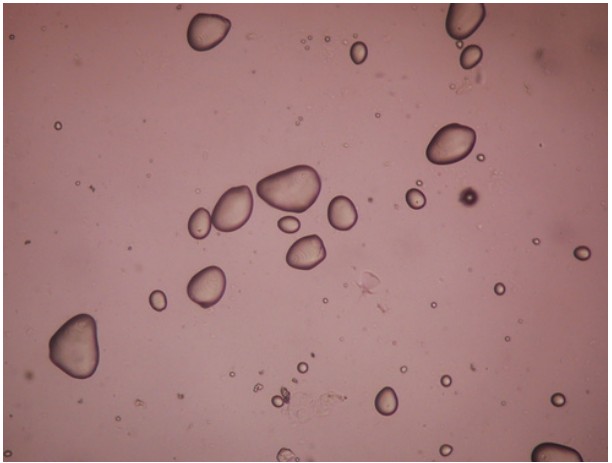 這是馬鈴薯的淀粉粒,只要切一小片馬鈴薯,然后在載玻片上涂抹,滴一滴水製成水埋玻片就可以觀察了。在低倍下,沒(méi)有染色只是一般的顆粒。