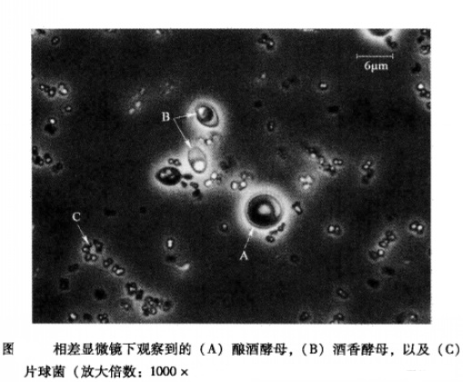 在葡萄酒陳釀期問(wèn)也會(huì)發(fā)現(xiàn)一些其他酵母和細(xì)菌,部分微生物常導(dǎo)致葡 萄酒腐敗。相差顯微鏡下觀察到的(A)釀酒酵母,(B)酒香酵母,以及(C )